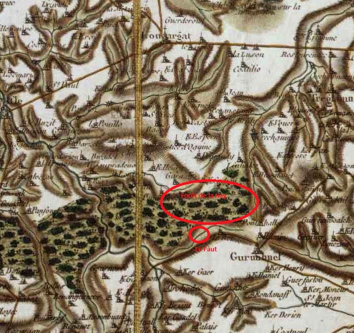 Qu'à cela ne tienne, je lance la France à la Loupe et j'affiche la commune de Gurunhuel. Où je trouve le village du Faut (Fot) sur Gurunhuel, séparé de Louargat par ce que l'on appelle aujourd'hui la forêt domaniale de la Hay. Voici ce que cela donne sur la carte de Cassini associée.